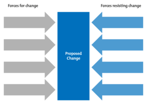 11. Divide into teams of 3 to 5 people with a maximum of 5 teams. Individually take a sheet of paper and divide it into two columns. List the forces that are for the change in left-hand column and those against in the right hand column.
