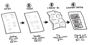 3. Crazy 8s: This is a fast-paced exercise where everyone rapidly sketches eighth variations of their ideas (1 minute per sketch - overall 8 mins)