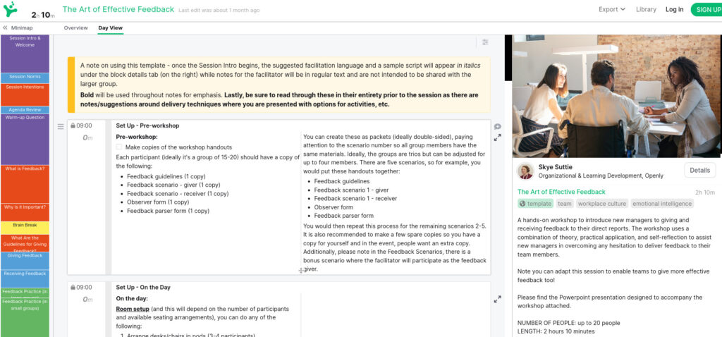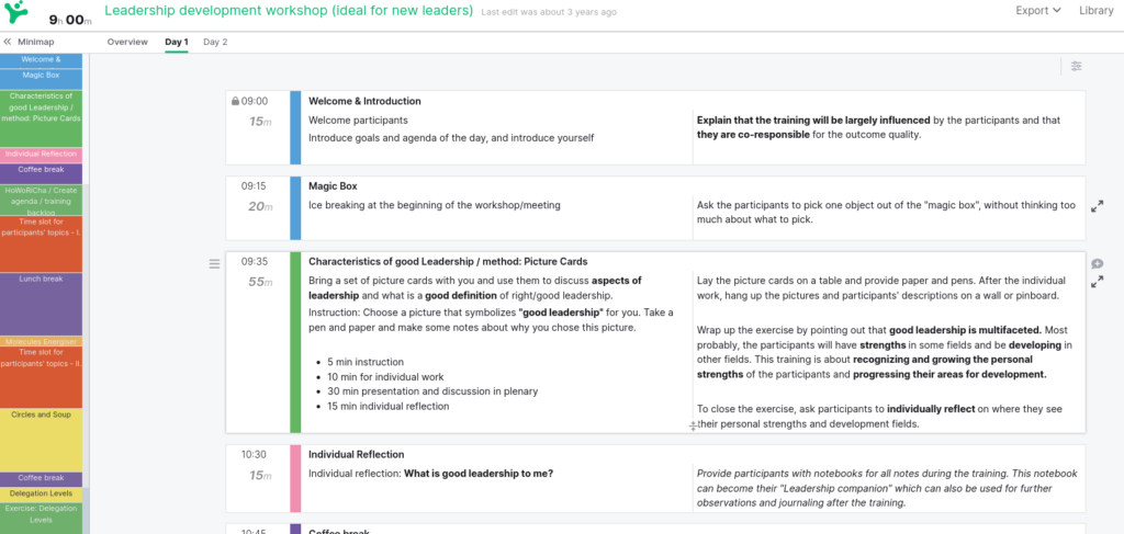 You’ll find classics from well-known frameworks such as Liberating Structures, as well as methods tested and added by facilitators across the globe. When using SessionLab’s planner, you can add methods from the library directly into your agenda, making the flow of designing skills training much more effective.