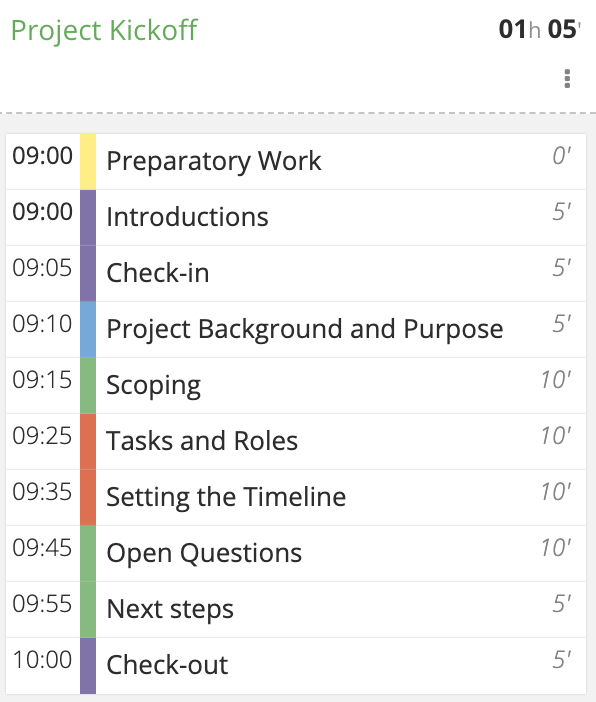 Starting a new project is always worth getting together for. Even if you’re doing preparatory work in a collaborative Google document or working asynchronously for much of the project, a kick-off meeting in real time is an efficient way to align and surface any issues before getting down to work in earnest. Let’s take a look at this meeting agenda template to see how you can set off on the right foot with a short, one-hour meeting.