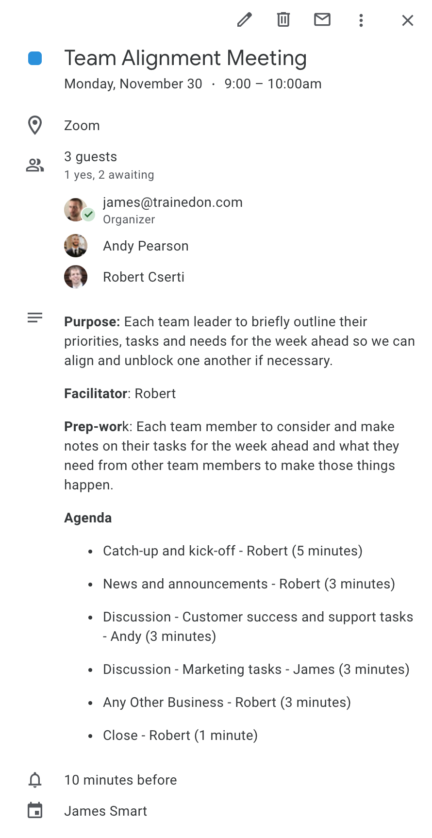 Here’s a simple meeting agenda template made using Google Calendar. Feel free to copy the format and use it for your next team meeting!