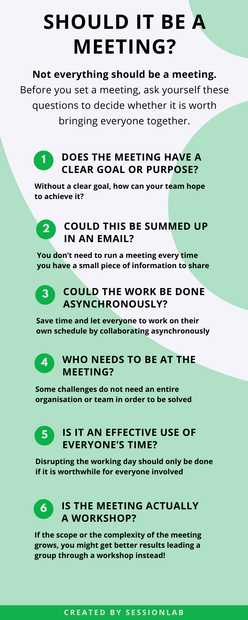 Organized and well-facilitated meetings can be hugely productive to any group or organisation but not everything should be a meeting. In fact, some meetings can be detrimental to your team if they aren’t thoughtfully designed and run.