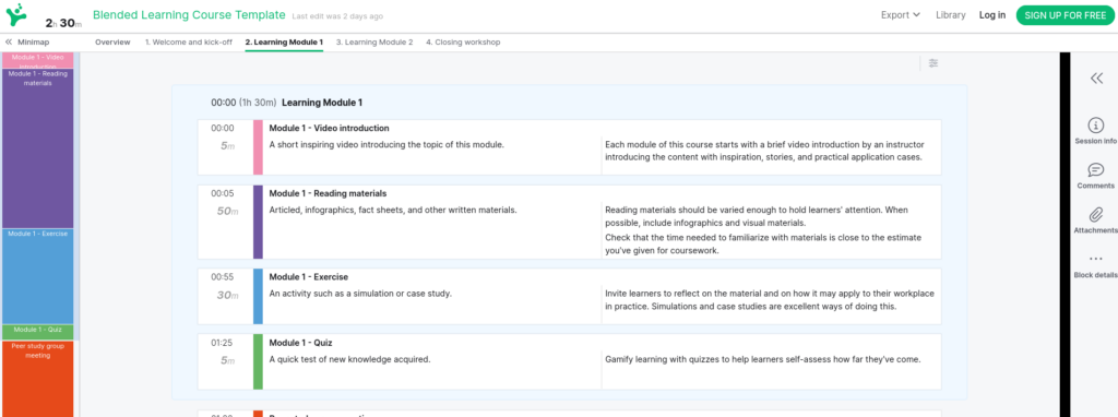 We’ve heard from a business school learning design team that they color-code sections of their courses in a high-level SessionLab outline of the program. Different colors make it immediately evident what is done, what is missing, and where builders and training developers need to do some work.