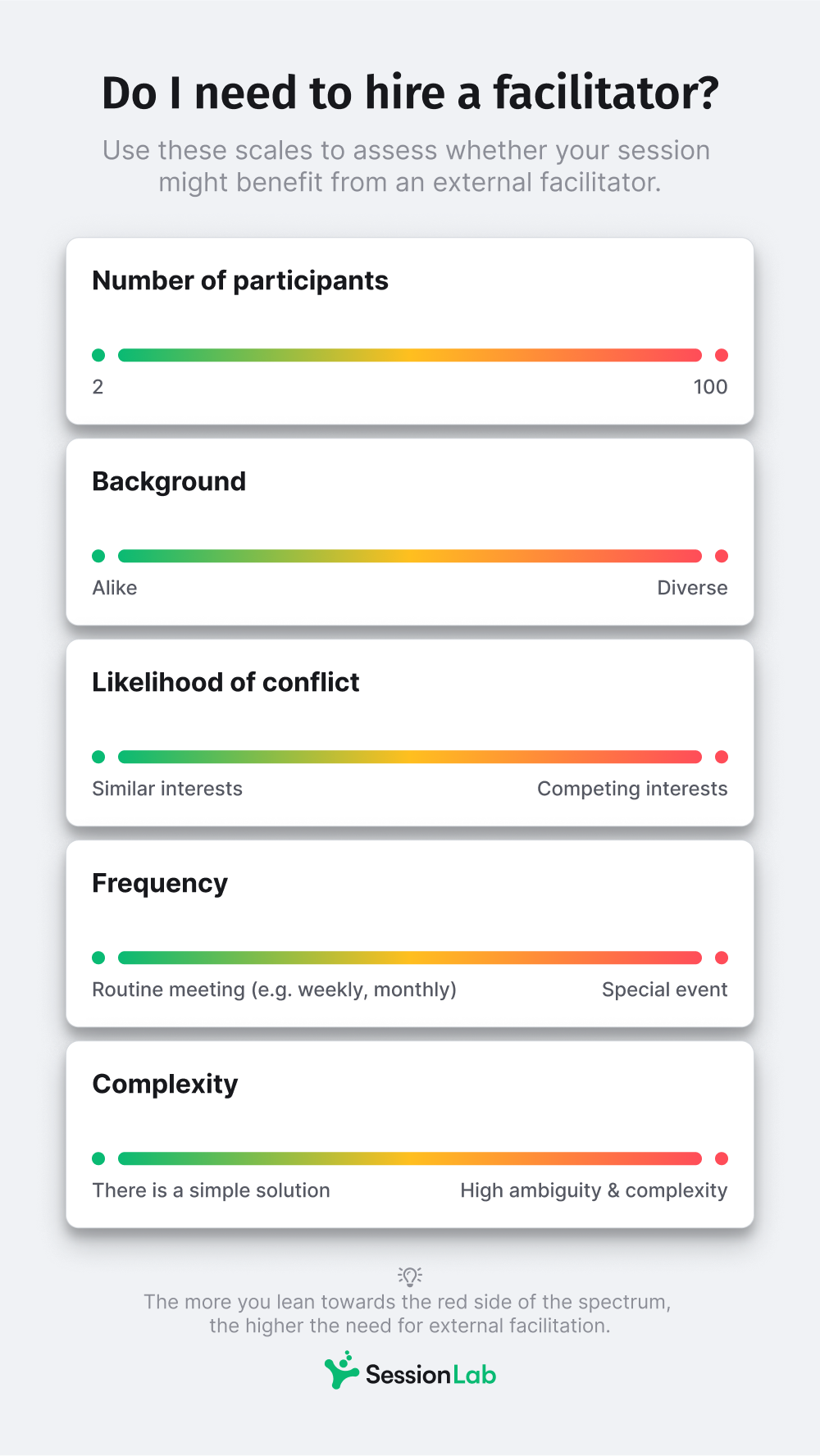 We’ve made a handy summary of factors that could lead you to decide to get some extra support. Use it to self-assess if your next session, conference or event might benefit from the participation of external facilitators.