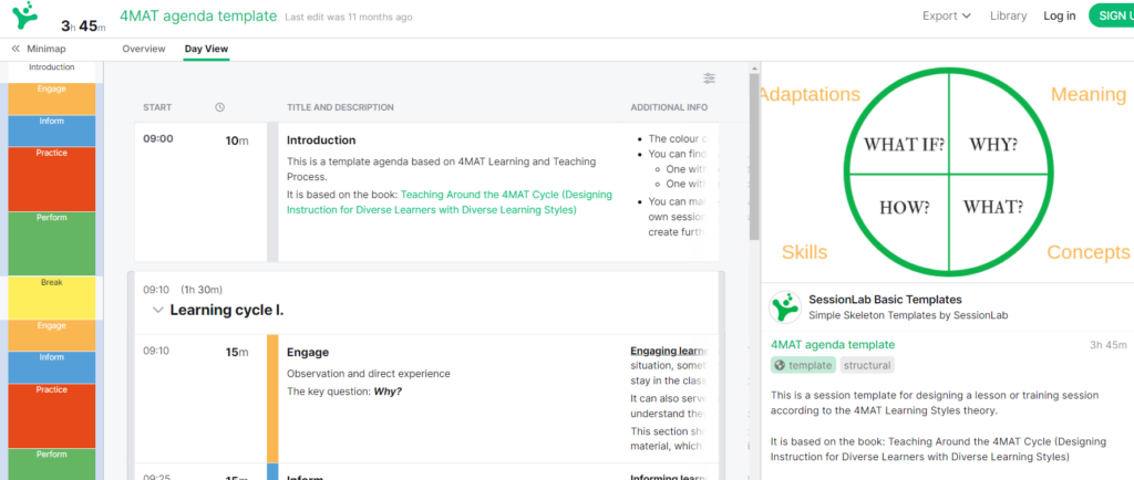 In this section, we will look at three frameworks trainers refer to, that can help you make learning courses engaging for different types of learners. For each, you will also find a ready-made template you can use to see what such dynamic training experiences look like in practice. Using SessionLab’s planner, you can drag and drop sections of these templates to customize them based on your design needs.