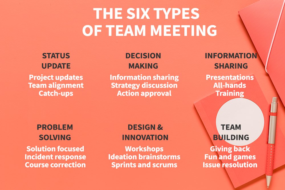 Here are some of the most common types of team meetings, with a rundown of what they might involve and how you might run them.