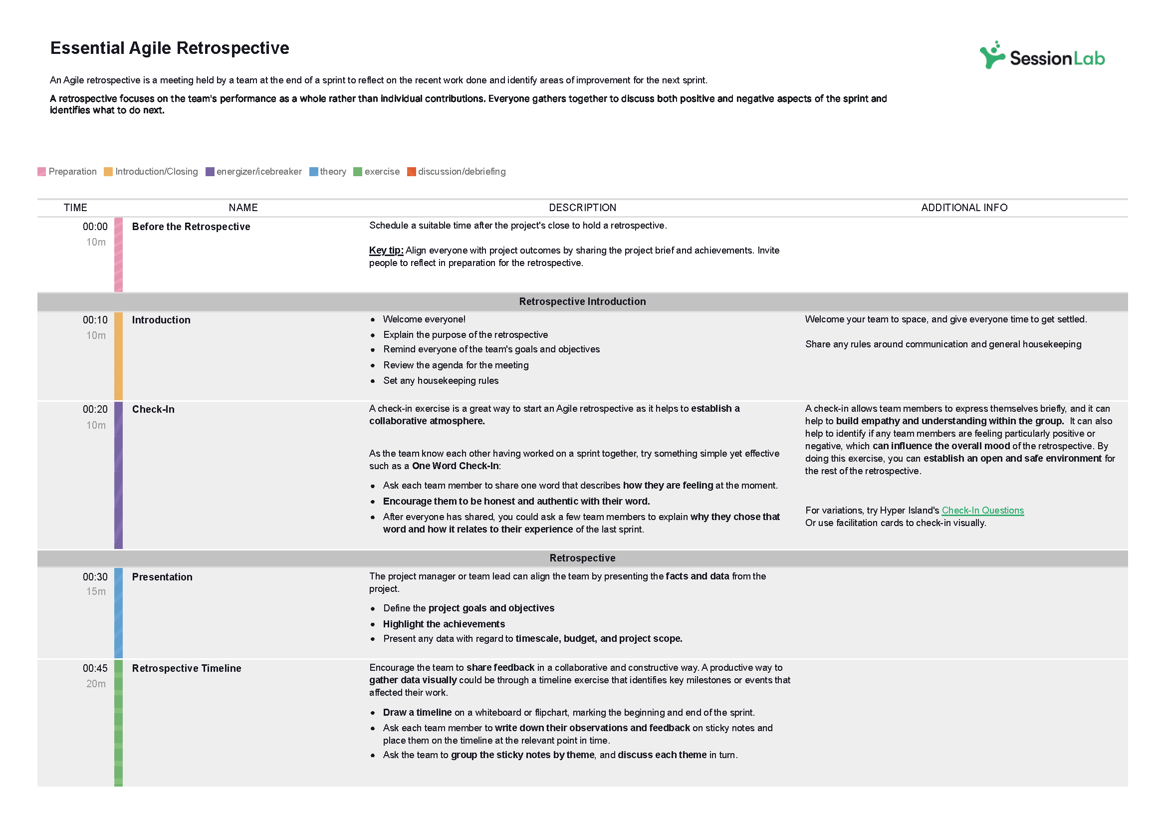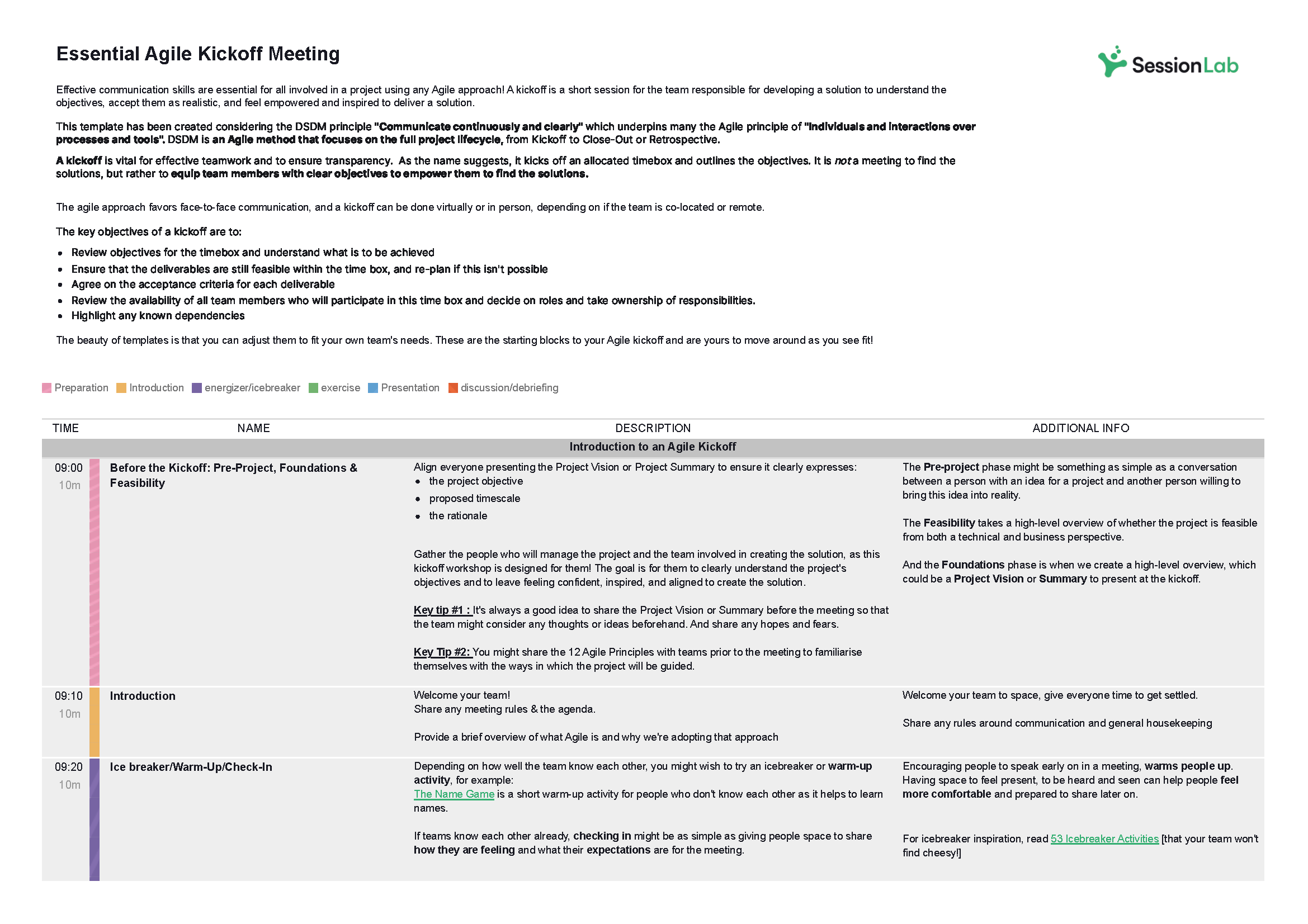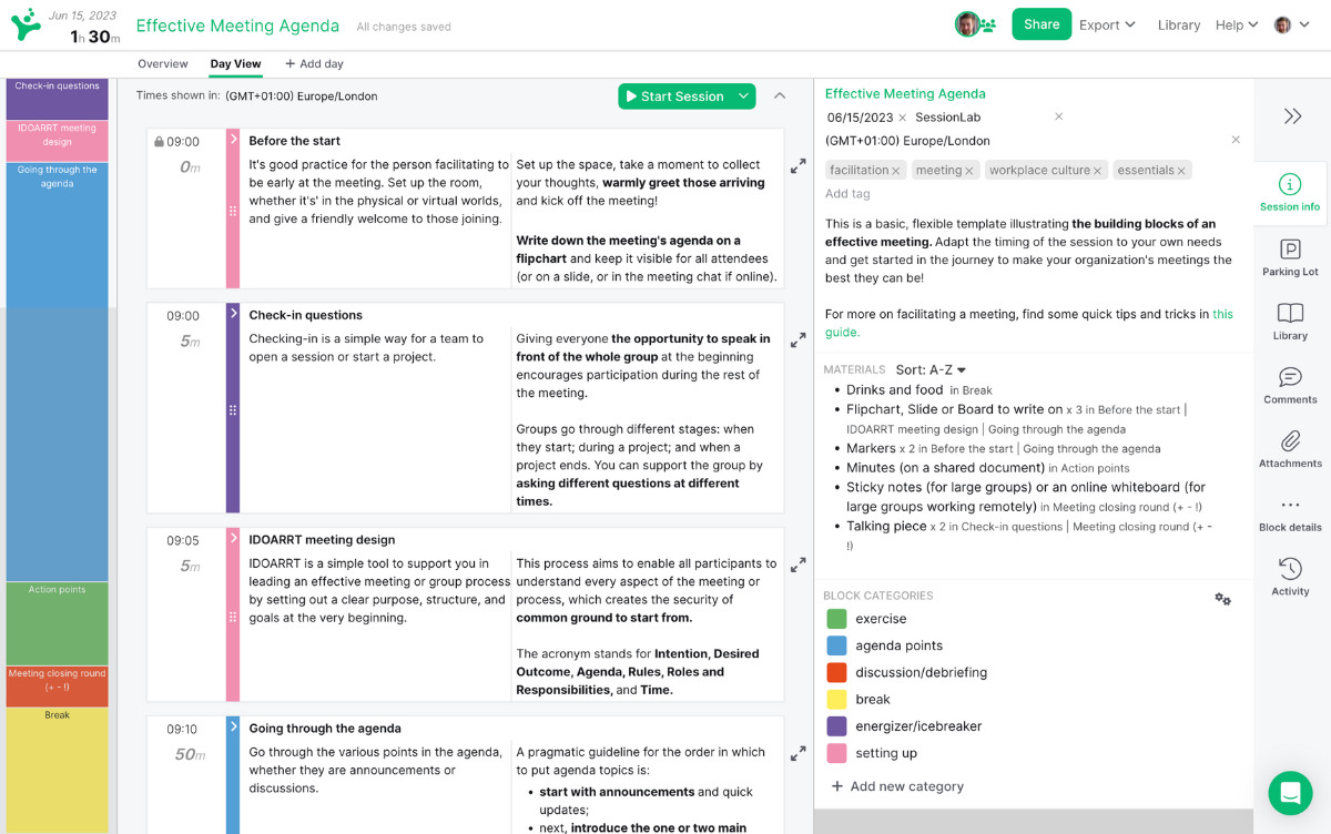 - Detailed agendas like this benefit from an easy-to-understand structure and time-boxed sections. Use SessionLab’s Session Planner to set clear timings and stay in control of your agenda.