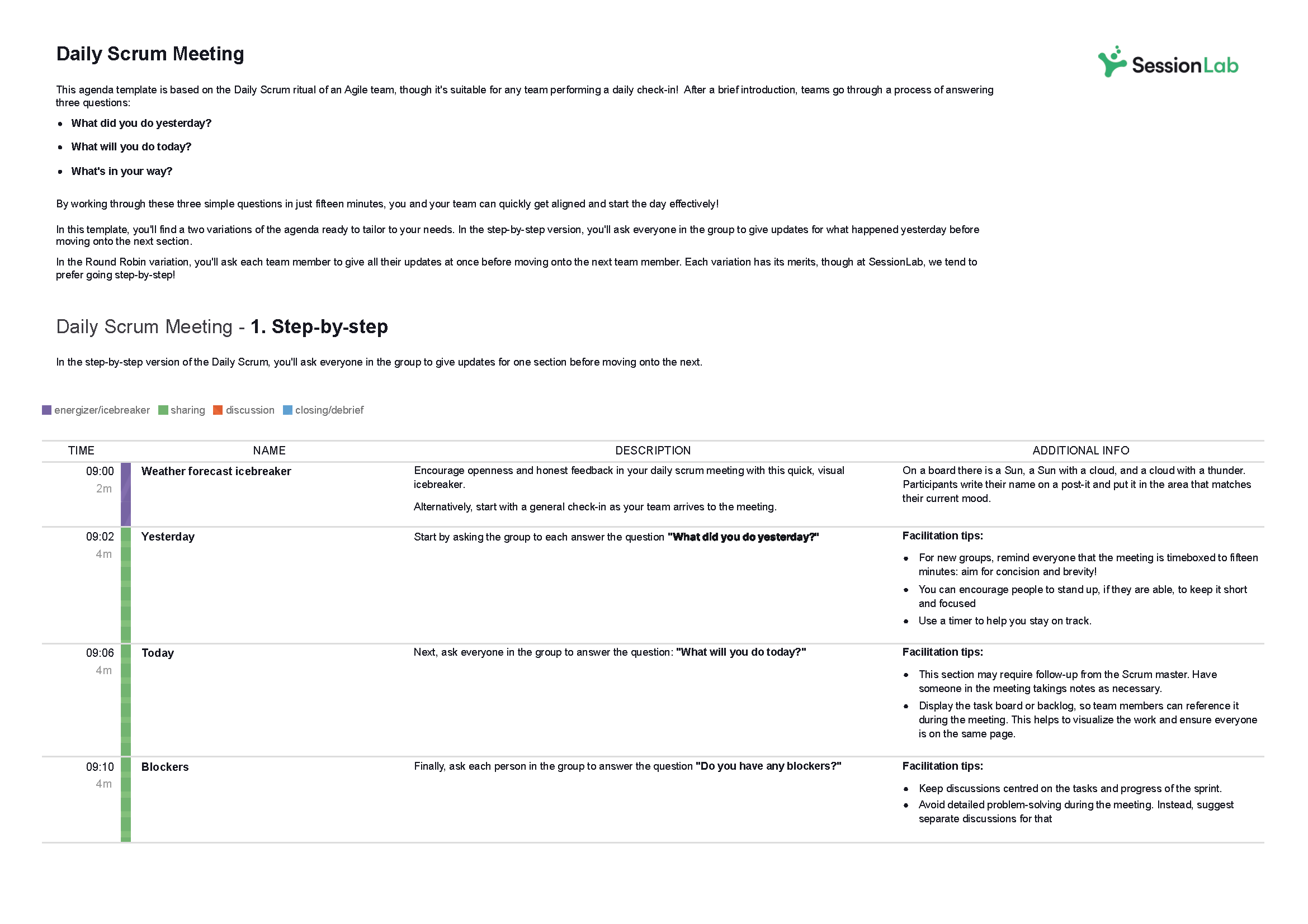 You’ll find a Word agenda template for each session, alongside a SessionLab meeting agenda templates you can use to take your agenda design to the next level.
