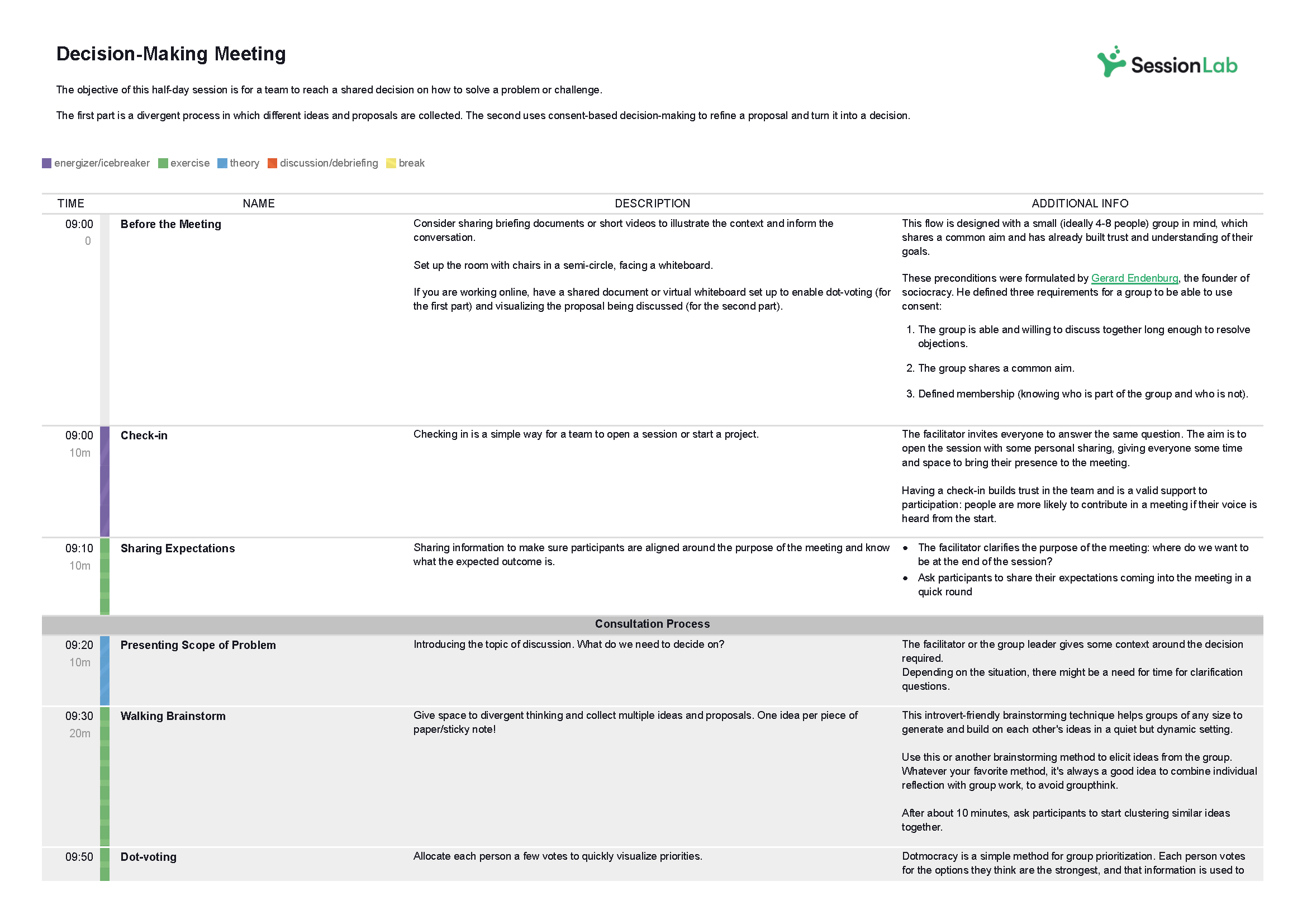 - Try to get familiar with consent-based decision making and Sociocracy before running this kind of decision making model. A thorough knowledge of the methodology will help you lead this team meeting agenda template effectively.
