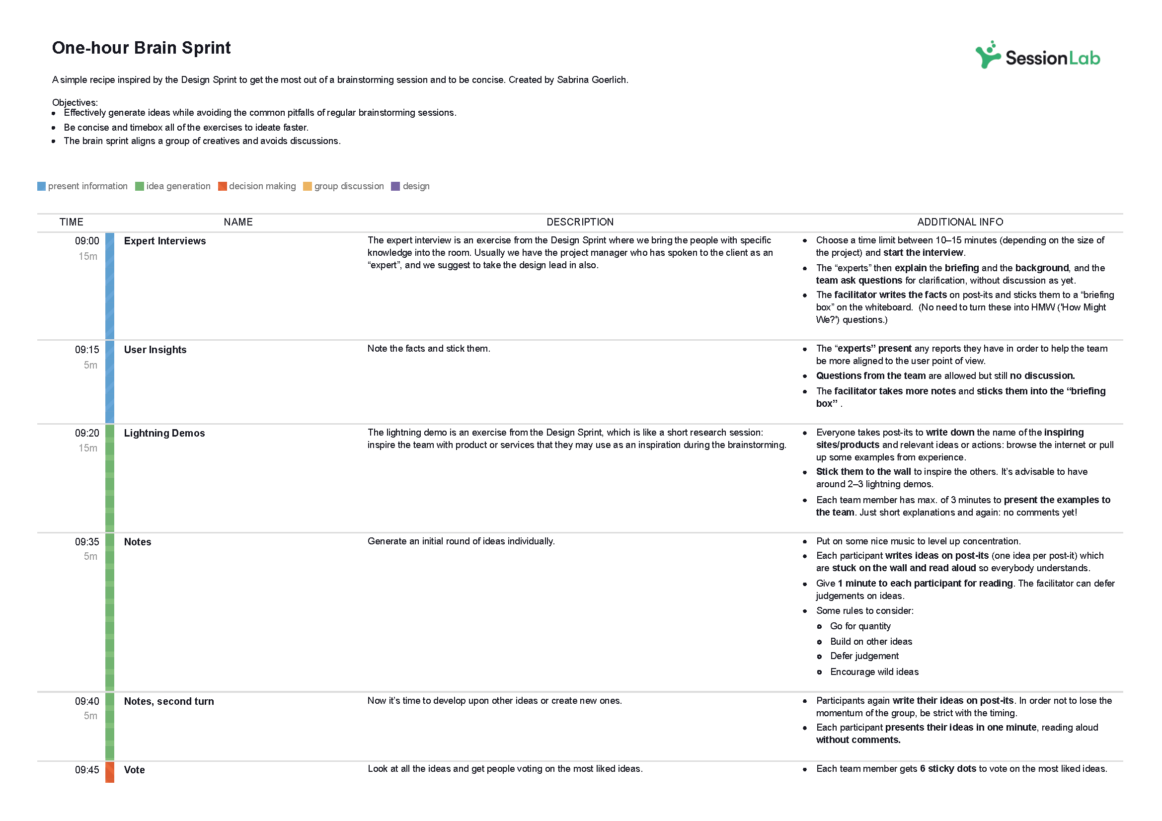 In this team meeting agenda template created by Sabrina Goerlich, you and your team will spend just over an hour on a process based on Google’s design sprint, a proven structure for creating innovation and solving tough problems.