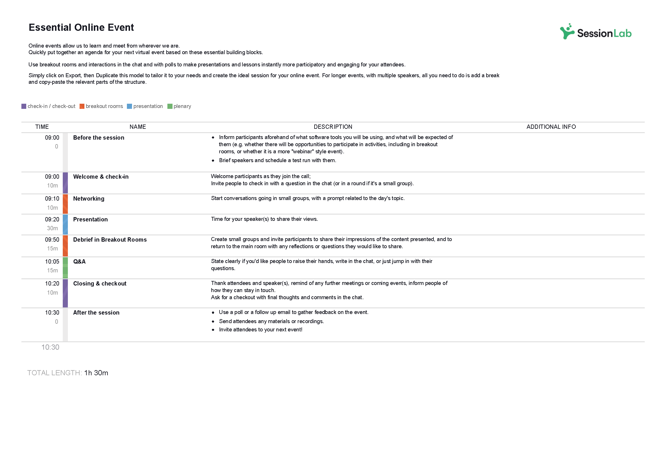 - Going for longer than 1 hour 30 minutes? Add a break! You might also add a short break between particularly heavy items if energy dips or you feel like people need a moment to reflect in silence. In the SessionLab agenda template, simple add an extra block or drag and drop existing items to make space.
