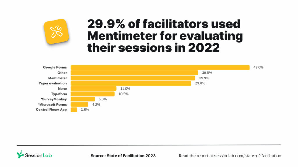 In 2022 SessionLab ran a survey of over 1100 facilitators from all over the world. A whole section was dedicated to tools, and you can now read the results in the State of Facilitation Report. What tools do facilitators use for design, delivery, and evaluation of sessions?