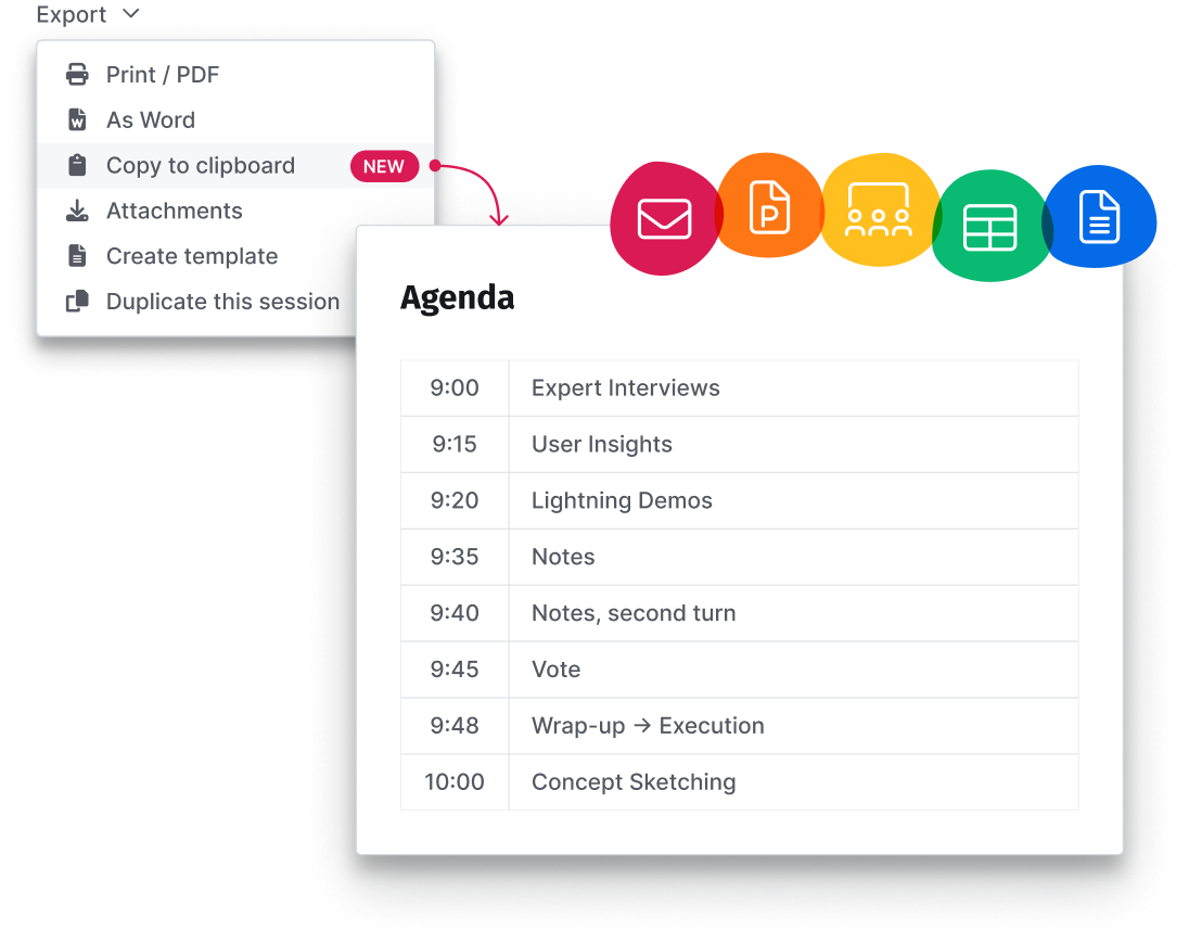 Sharing a visual breakdown of a session is the moment it’s made real. Save time and effort by creating a beautiful printout of your agenda with one click. Share your completed agenda with stakeholders in an easy-to-understand format.