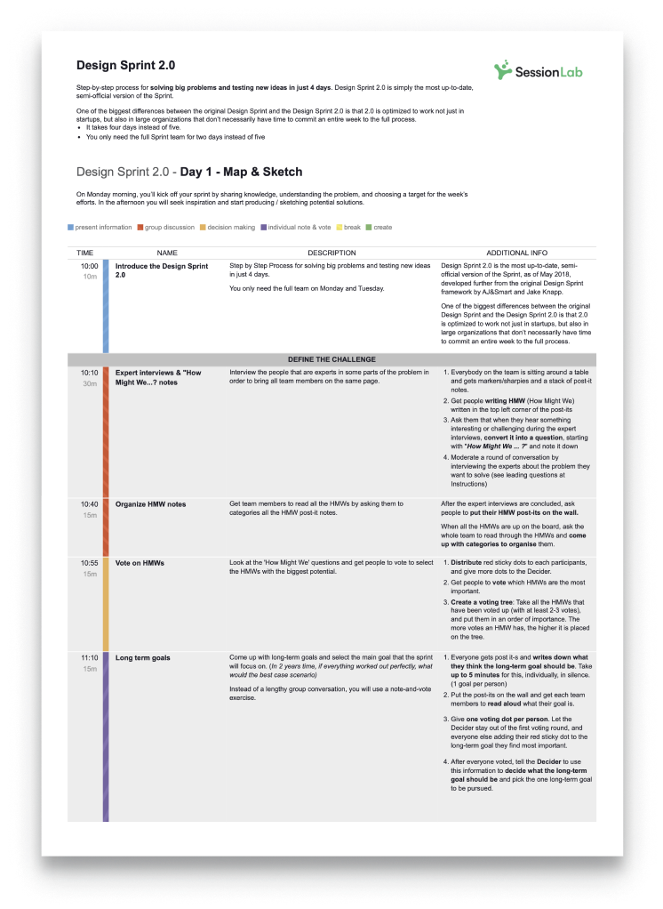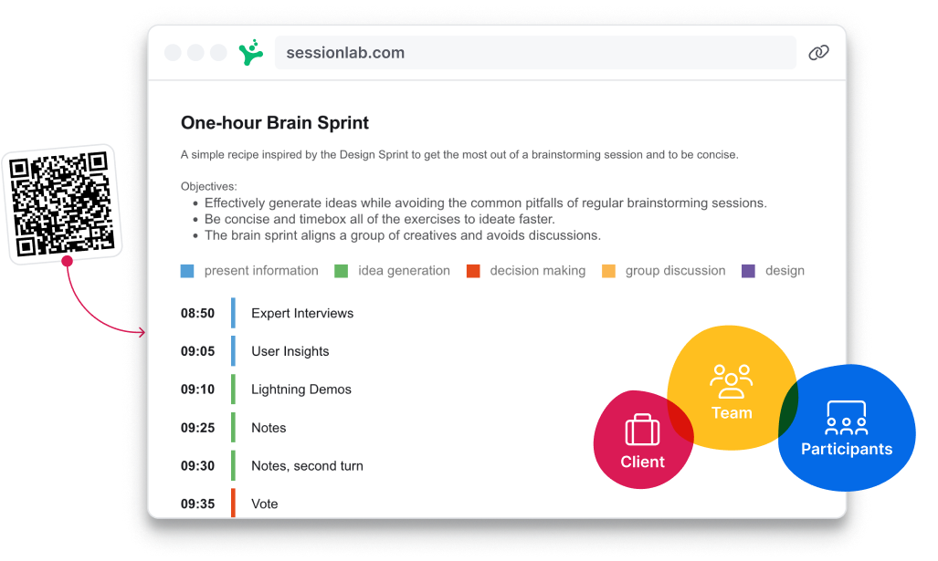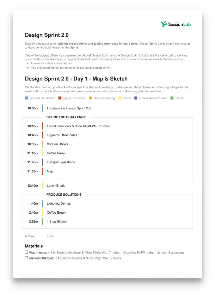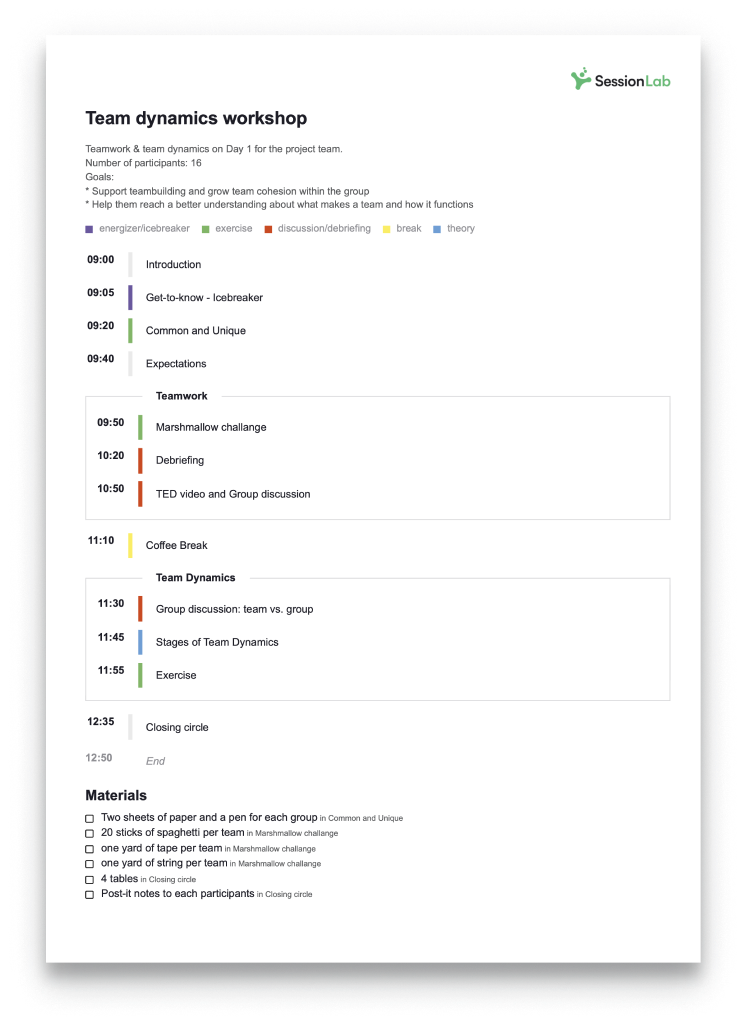 Display block categories, add your logo and display all the materials you need. Show and hide extra details with one click. Whatever your needs, SessionLab makes it easy to export your agenda in a style that’s right for you.