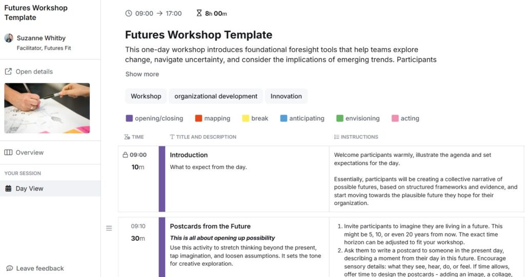 For more methods and inspiration, download SessionLab’s Facilitating Futures playbook, created in collaboration with futurist Suzanne Whitby of Futures Fit. It’s packed with 15 practical techniques, facilitation tips, and real-world stories to support your work.