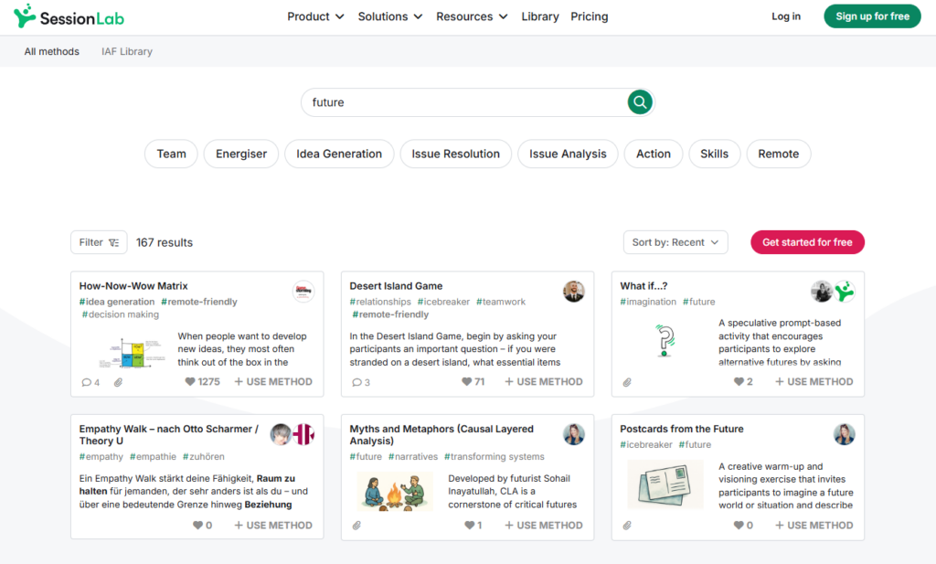 You can find these and many other methods in SessionLab’s Library. Just look for the keyword “Future”.