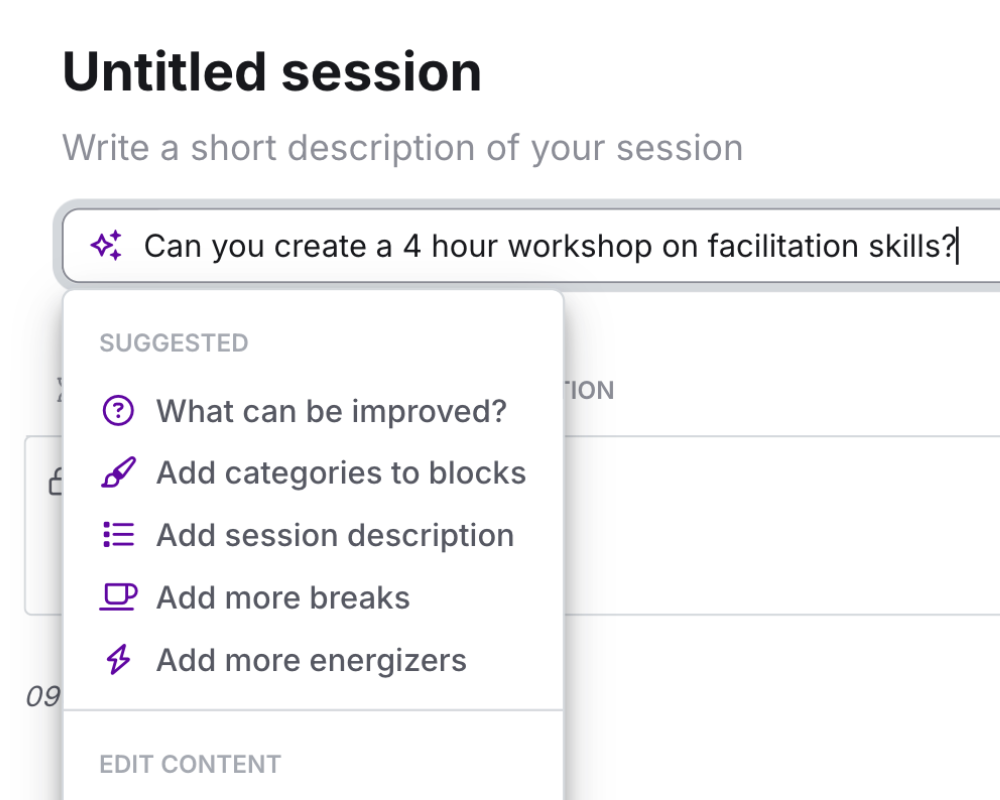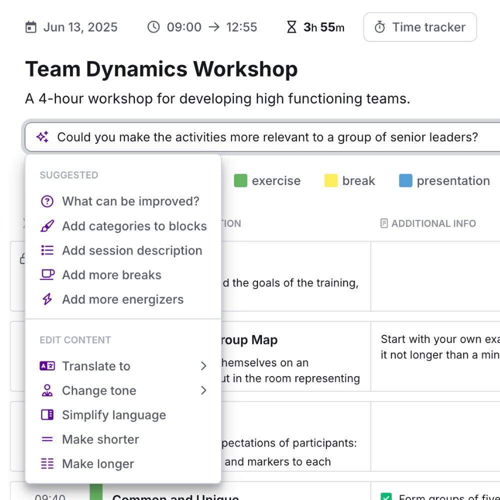 Get suggestions on session flow, alternative activities, and tailor content based on what’s actually in your agenda.